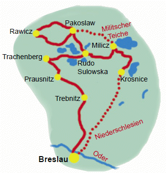 Breslau die Hauptstadt von Niederschlesien, eine der schönsten Städte Polens – direkt an der Oder gelegen. Das Bartschtal/Dolina Baryczy, eine der landschaftlich wertvollsten Regionen hebt sich hervor durch die Militscher Teiche. Sie wurden im Mittelalter von den Zisterziensern angelegt. Dieses Gebiet ist ein Paradies für Radler und Naturliebhaber, aber auch bekannt für Vogel- und Wildbeobachtungen und kulinarische Genüsse, wie z.B. Fischgerichte!