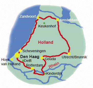 Diese Radtour führt Sie in schöne Städte, wie Gouda, Delft und Dordrecht. Genießen Sie die ein-malige Atmosphäre mit romantischen Giebeln und Grachten und probieren Sie den berühmten holländischen Käse. Dordrecht, die älteste Stadt Hollands, verfügt über nicht weniger als 1000 Denkmäler! Auch Rotterdam und Den Haag liegen auf der Route und wollen entdeckt werden.